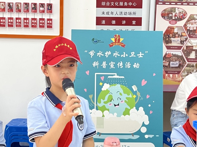 在社区活动中心,志愿者们向小朋友们介绍了“双碳”目标、水环境保护等基础知识,小朋友们认真听讲,并了解到一些力所能及的保护水资源的方法。在问答环节,小朋友们跃跃欲试,用学到的知识与志愿者们互动。