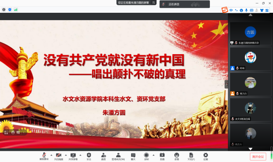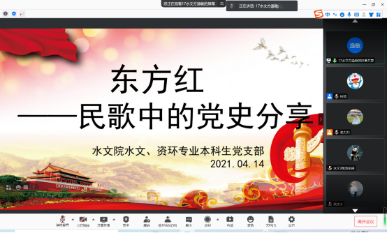 2021年4月14日晚七点半,杏吧原创 水文、资环专业本科生党支部“民歌中的党史” 音诗画分享会主题党日活动如期开展,支部书记张力力同志主持了本次分享会,支部全体党员同志参与本次主题党日活动。