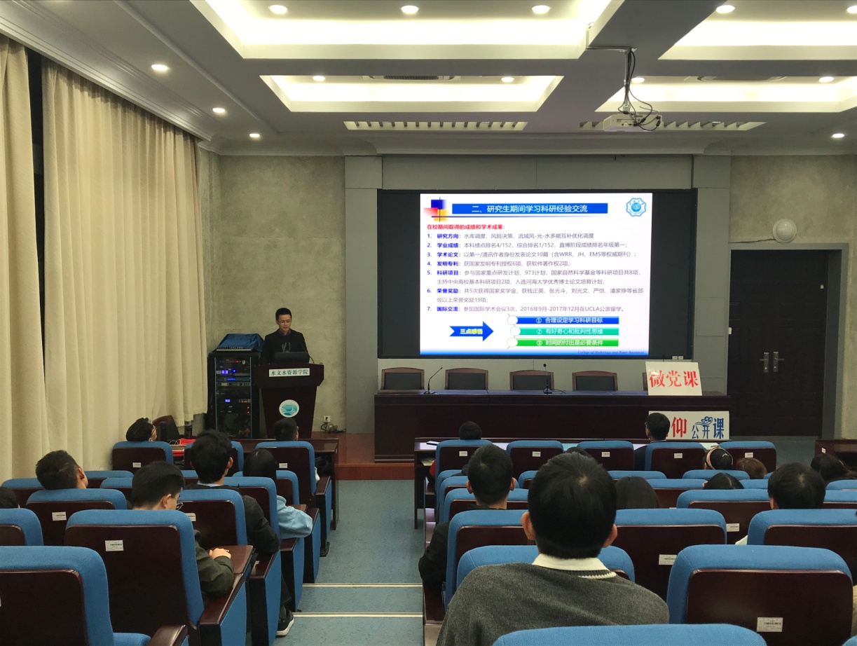 在党课中,张珂教授从刘光文先生事迹、光文精神的内涵、刘光文科学教育奖及自身学习和科研经历这四个方面向党员介绍。他说道:“刘光文,这个名字代表着一种学科的高度。”这是一种不畏艰险、勇于探索的态度;一项开拓创新、教书育人的文化;一块水润万物、河海水文的品牌;一个艰苦奋斗、无私奉献的境界。刘光文先生走过的路代表着艰辛执着的爱国之路、创业之路、奉献之路。朱非林博士后则是通过摘自其他人对刘光文先生的评价向我们表达了刘光文先生的四种精神。分别是崇高的爱国精神;严谨治学、钻研敬业的精神;乐于助人、不计回报的精神;淡泊名利、无私奉献的精神。之后朱非林博士后分享了他设定的学习科研目标,他表示作为一名研究生党员,必须具有好奇心和批判性思维,必须要有时间的付出,踏踏实实才能做好学术工作。