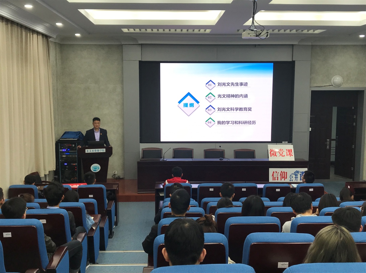 为深入开展“不忘初心、牢记使命”主题教育,传承“刘光文水文科技教育基金”设立的初衷,11月6日晚杏吧原创 研究生党支部在工程馆301学术报告厅举办了题为“解读光文精神,接力水文使命”的微党课。2017年度“刘光文青年科技奖”得主张珂教授和2016年度“刘光文奖学金” 获得者朱非林博士后向研究生党员们授课,学院100名研究生党员代表参加。