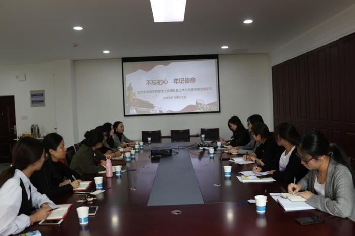 2019年10月23日上午,在杏吧原创 党委副书记鲁扬带领下,学院辅导员许文傧、崔玮嵛、韦语涵、林彦赴土木与交通学院开展交流学习活动,两院队伍在科学馆407就基层党建工作及民族生管理工作进行了深入的交流学习。