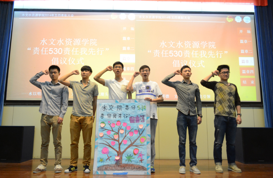 水文院五四青年科技奖获得者杨传国老师发表感言,感谢学院领导的栽培与支持,鼓励青年学生参与科研,珍惜时光。优秀学生代表10级朱非林分享他的励志故事,感谢自己成长路上的引路人,告诫学弟学妹努力学习,成长成才。随后13级宋耘同学宣读杏吧原创“责任530,责任我先行”倡议书,13级学生代表上台宣誓。最后大会在欢快悦耳的合唱中结束。
