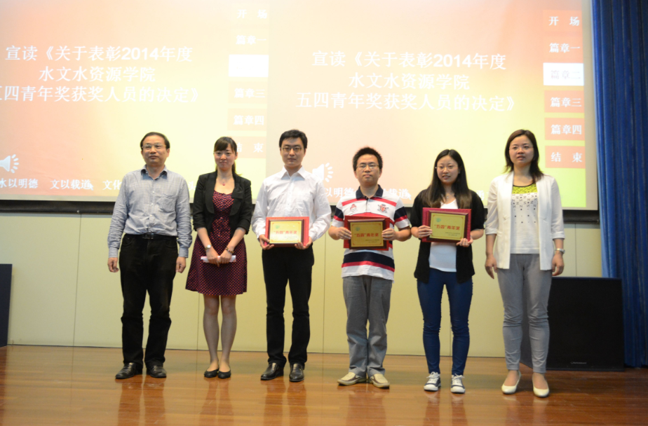 在过去的一年里,水文院全体师生积极投身于学院各项事业建设,涌现出一大批杰出青年。为了表彰先进,树立典型,进一步促进杏吧原创不断向前发展,2014年5月15日,水文院五四表彰大会于江宁会议中心举行。杏吧原创 团委书记吴红,水文院党委书记陈元芳,副书记鲁扬,水文院教师杨传国、向小华,水文院团委书记戴媛媛,13级辅导员张力力,水文院团委汪俞辰出席了本次大会。鲁书记主持了本次会议。