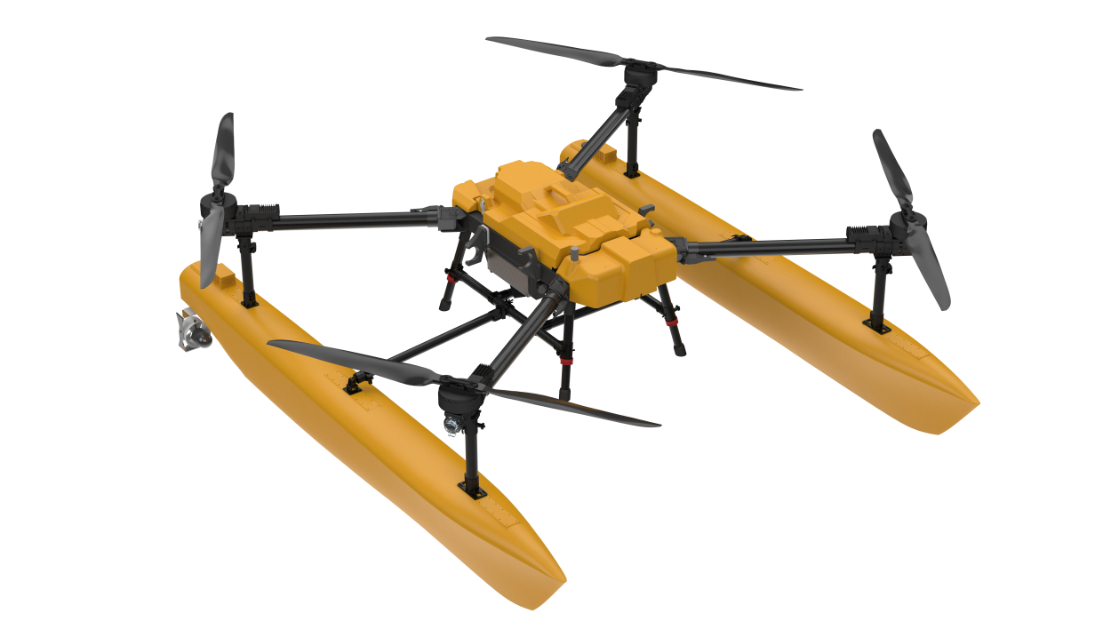 电动两栖四旋翼无人机为我公司首创专利产品,具备水上起降、水上航行、水上作业的能力,主要应用于水域巡检执法、环境保护监测、水上科学考察等场景。该产品具有无人机和无人船的双重功能,可高效地完成多种水上作业。