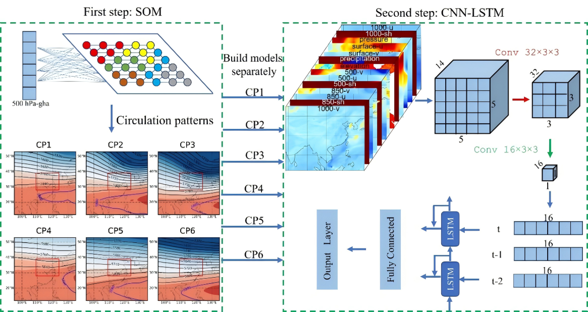 针对复杂因素影响下的降水预报及误差校正问题,研究团队提出了一种基于大尺度环流分型与时空深度学习模型相耦合的预报降水统计后处理方法。首先采用自组织图(SOM)对大尺度环流模式进行分型,在此基础上采用时空深度学习模型(CNN+LSTM)对每种环流模式下的局部降水进行校正,考虑周围地形和气象因素对中心格点降水,以及前期降水对当天降水的影响。淮河流域应用结果表明,该方法可以显著提升预报降水的订正精度。本研究可为降低水文模型输入误差、延长洪水预报的预见期提供支撑。