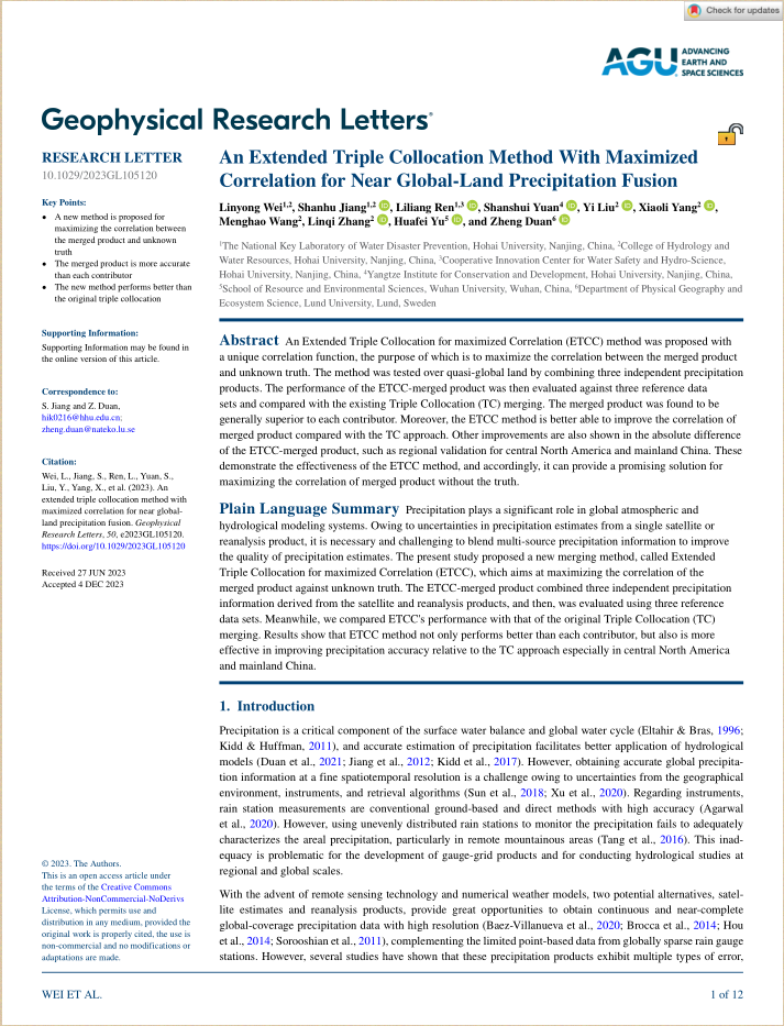 论文链接:Wei, L., Jiang, S., Ren, L., Yuan, S., Liu, Y., Yang, X., Wang, M., Zhang, L., Yu, H., Duan, Z., 2023. An Extended Triple Collocation Method With Maximized Correlation for Near Global-Land Precipitation Fusion. Geophysical Research Letters, 50, e2023GL105120. //doi.org/10.1029/2023GL105120